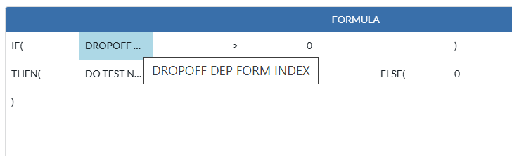 - In the calculated field they could say if Drop Off Dependency Form Index > 0 then do (x) Else (y). On all the Pickup Dependency Form rows it will trigger the Else while on all the Drop Off Dependency Form rows it will trigger the Then.